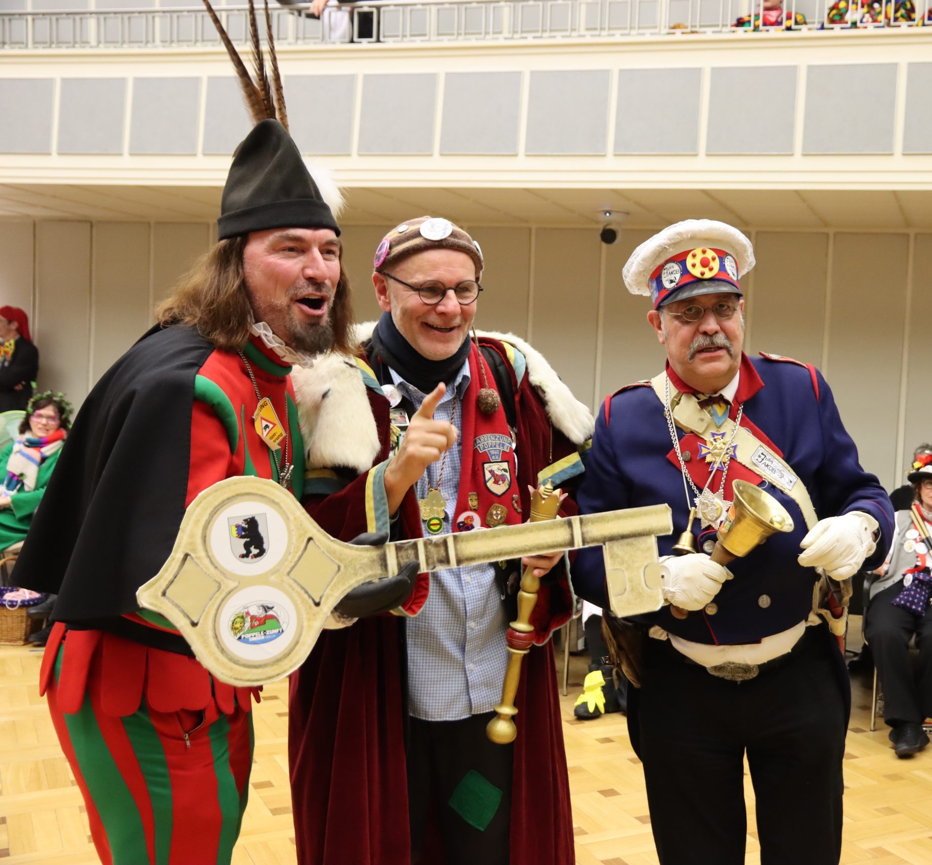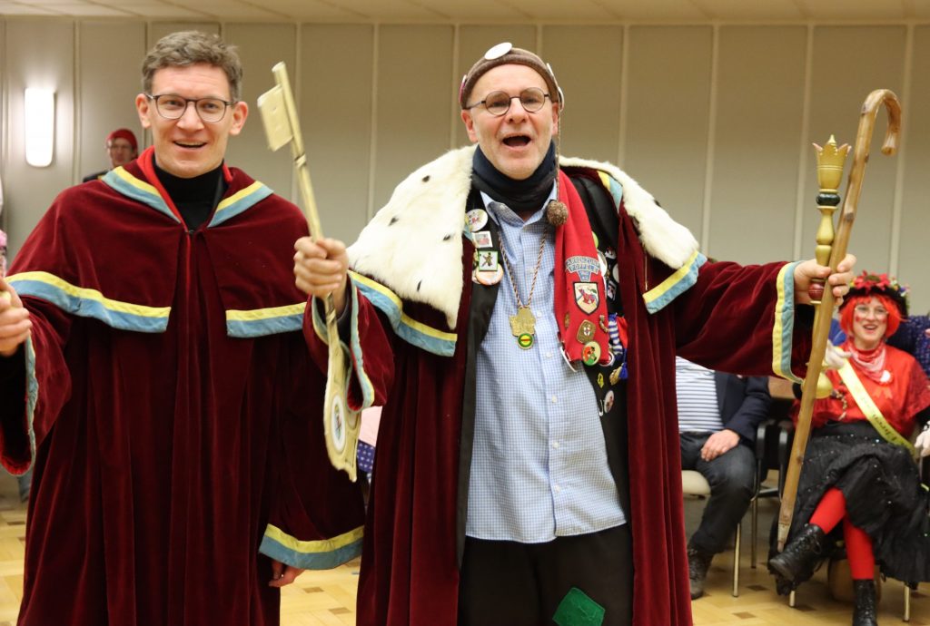 Die Poppele-Zunft hatte keine Gnade mit Oberbürgermeister Bernd Häusler und dem ersten Beigeordneten Marcus Röwer. Singen. Das Rathaus in Singen ist unter Kontrolle der Narren. Die Poppele Zunft hat nämlich am Schmotzigen Dunschtig dort den Rathausschlüssel und die Macht über das Haus übernommen. Auch dem ersten Beigeordneten der Stadt Marcus Röwer blieb beim Urteil der Narren nur die Kapitulation. Im Pantomimespiel der Zunft wurden die beiden Rathauschefs letztendlich ins Exil auf die Festungsruine auf dem Hohentwiel entsendet.