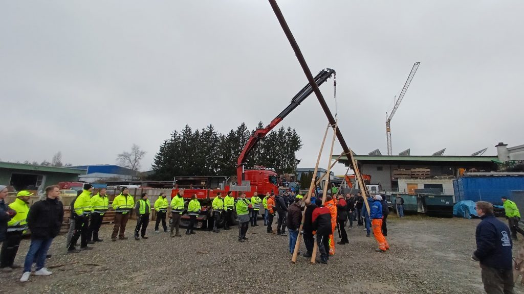 Aber nicht nur die Zunftgesellen der Poppele-Zunft trainierten – mit dabei waren auch die Baumsteller der „Binninger Bommseckel“ sowie des Narrenvereins Katzdorf Arlen, die vom Zunftgesellen Helmuth Markgraf schon eine theoretische Einweisung bekommen hatten und nun in die Praxis gegangen sind. Jede Zunft stellte erfolgreich den Baum einmal auf.