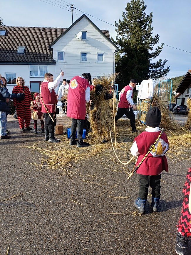 Nach dem Narrenbaumstellen fand ab 13.00 Uhr an acht verschiedenen Stationen ein „ordentliches Strohbäreneinbinden“ statt. Die Hoorigen Bären der Poppele-Zunft mussten „nur“ in ihre Häser schlüpfen, da das Erbsenstroh traditionell jedes Jahr neu auf einen Anzug genäht wird und so die ganze Fasnet durch genutzt werden kann. Mit einer kleinen Delegation nahm dann die Poppele-Zunft auch am Umzug in Böttingen teil.